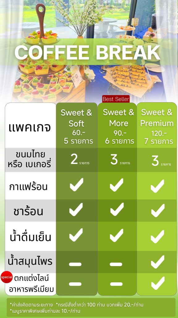 รับจัดคอฟฟี่เบรกนอกสถานที่ (Coffee Break) ขนมผลิตใหม่ตามออเดอร์ และใช้วัตถุดิบคัดเฉพาะเกรดดี ผลิตในโรงงานผลิตขนมมาตรฐาน